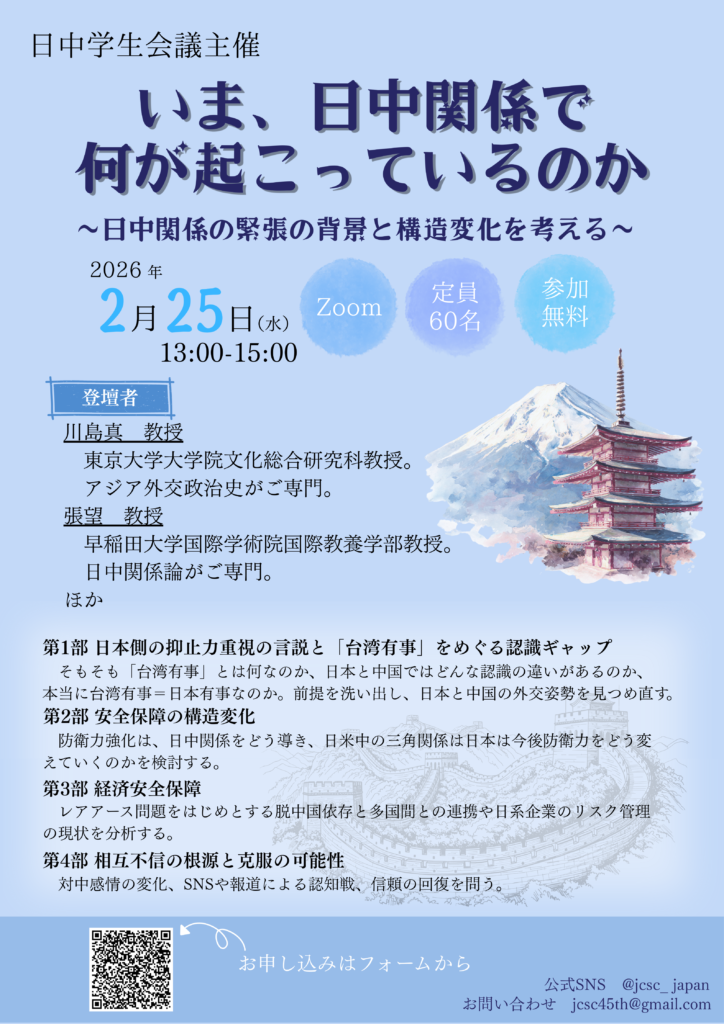 日本の対中政策は今、大きな転換点にあります。本イベントでは、その変化を安全保障と経済の両側面から整理し、構造的に考察します。なぜ日中間で不信感が強まっているのか――その背景を学術的・実務的な視点から読み解きながら、今後の日中対話の可能性を、パネリストお二人とのパネルディスカッションを通じて探ります。